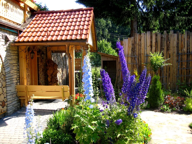 Dom z bali drewnianych na kamiennej podmurówce otoczony przepięknym ogródkiem.